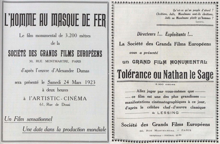 Pour sa sortie en France, justement, c’est la toute nouvelle société Les Grands Films Européens qui s’occupe de sa distribution. Située rue Montmartre dans le 9e arrondissement de Paris, la société a pour but, comme son nom l’indique, d’acquérir les droits d’exploitation de prestigieux films étrangers pour les distribuer sur le territoire français. D’après nos recherches, ces films « européens » sont en réalité tous de nationalité allemande : Kaiserin Elisabeth von Osterreich donc, mais aussi plus tard L’homme au masque de fer (Der Mann mit der eisernen Maske – 1923 – Max Glass) et Nathan le Sage (Nathan der Weise – 1922 – Manfred Noa). C’est que le traumatisme de la Première Guerre mondiale n’est pas loin, et le public français sûrement peu enclin à se déplacer en salles pour aller voir des films de « boches ». Ainsi, la dénomination « Grands Films Européens » passe mieux que « Grands Films Allemands », et permet au distributeur de camoufler l’origine véritable des films qu’il propose.